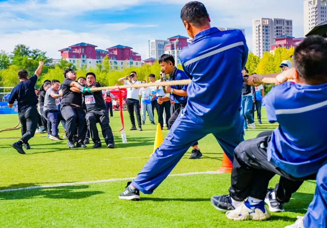 趣味项目区域同样气氛热烈,欢声不断。拔河比赛的呐喊助威声震耳欲聋,旱地龙舟的“步调一致”考验着团队默契,“8”字跳绳的流畅穿梭展现了队员间的完美配合。这些项目既活跃了赛场气氛,也在轻松愉快的氛围中增强了团队凝聚力。