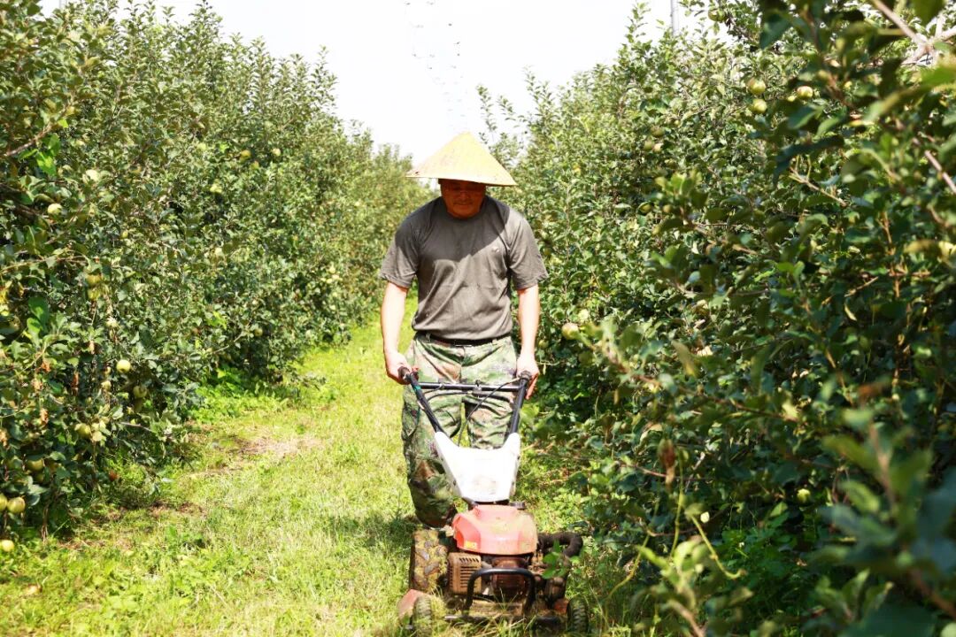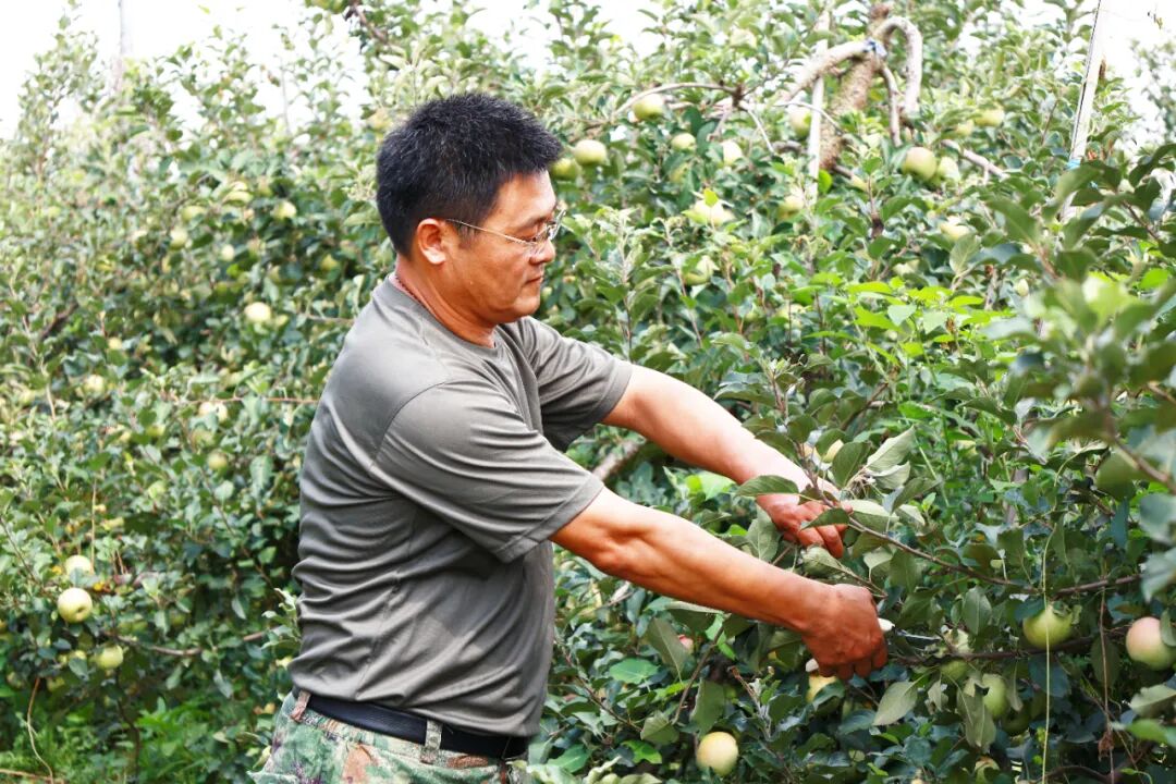 清晨的薄雾还未散去,曾宪宝换上工装,戴上草帽,手持果剪走进了果园。阳光透过枝叶间隙洒在果树上,一颗颗饱满圆润、刚开始泛红的苹果坠满枝头,曾宪宝轻轻抚过挂着露珠的苹果。