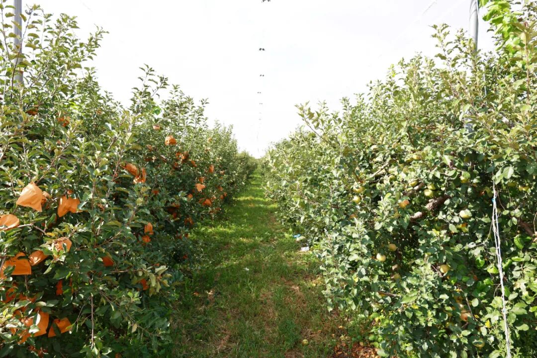 “这一片是我们跟深圳‘百果园’合作的80亩红富士苹果定向销售基地,用的是白蜡袋。”曾宪宝解释道,“白蜡袋是用纤维材料制作的,通透性好,透光率能达到70%左右,再配套专门的日常水肥管理,果实经过充足的阳光照射,糖度更高。”