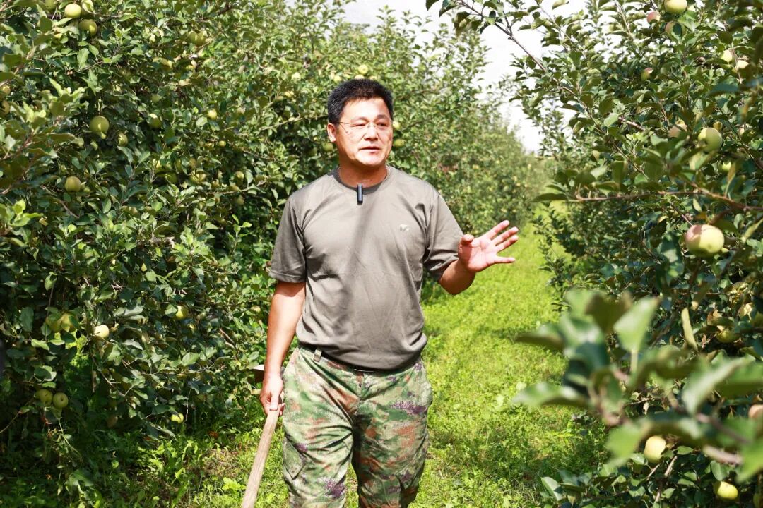 “你看这片果园,没套袋吧。但它跟套袋苹果一样,果皮非常光亮,能防虫害,而且比套袋苹果的日照时间更长,更甜!”