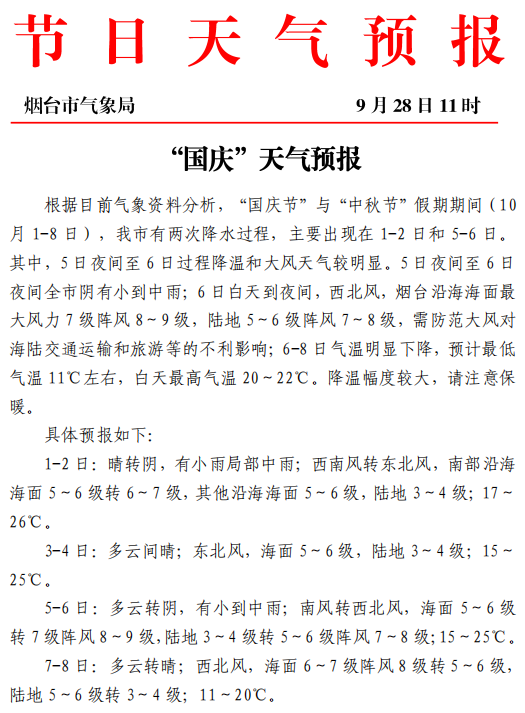 根据目前气象资料分析,“国庆节”与“中秋节”假期期间(10月1-8日),我市有两次降水过程,主要出现在1-2日和5-6日。其中,5日夜间至6日过程降温和大风天气较明显。5日夜间至6日夜间全市阴有小到中雨;6日白天到夜间,西北风,烟台沿海海面最大风力7级阵风8~9级,陆地5~6级阵风7~8级,需防范大风对海陆交通运输和旅游等的不利影响;6-8日气温明显下降,预计最低气温11℃左右,白天最高气温20~22℃。降温幅度较大,请注意保暖。