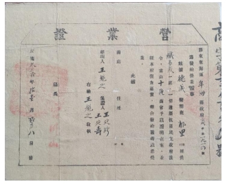 胶东东海区牟海县政府颁发的王魁之的织布厂营业证。1941年2月中旬,中共胶东区委决定将牟平县、海阳县各划出一部分,成立牟海县。区域包括牟平县的第八、九、十区全部和第六、七区南部,以及海阳县的部分区镇。3月8日,牟平县、牟海县正式分暑办公。