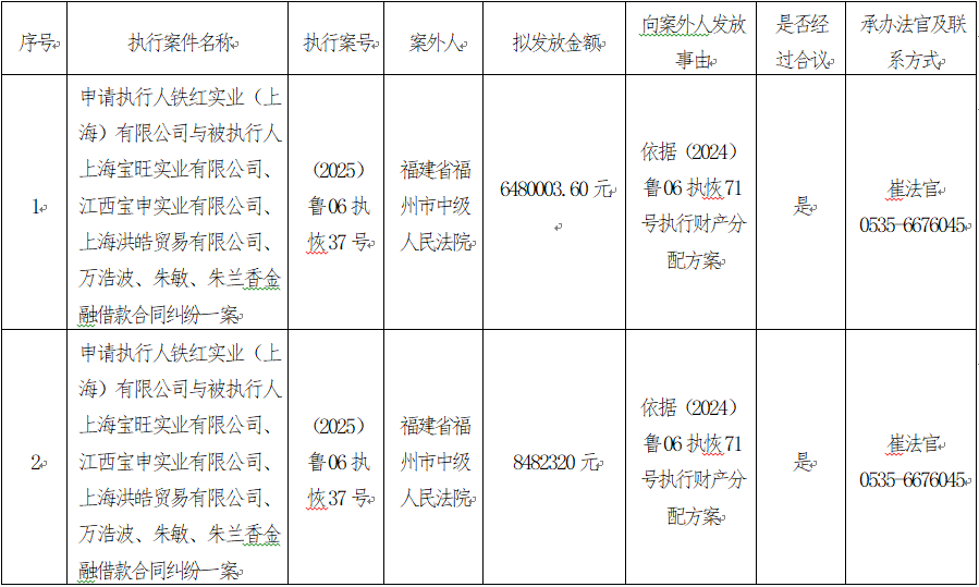 为进一步严格执行案款管理,规范执行案款发放程序,确保执行案款发放安全,根据《最高人民法院关于执行款物管理工作的规定》等相关规定要求,现对以下执行案款发放事宜进行公示,公示期为三个工作日(2025年9月30日-10月10日),案件当事人或者其他利害关系人如有异议应当在公示期内提出并提交相关证据材料,公示期满无异议的,本院将按照执行案款管理的相关规定办理发放手续。