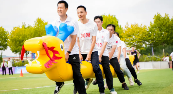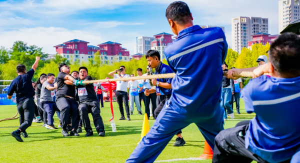 趣味项目区域同样气氛热烈,欢声不断。拔河比赛的呐喊助威声震耳欲聋,旱地龙舟的“步调一致”考验着团队默契,“8”字跳绳的流畅穿梭展现了队员间的完美配合。这些项目既活跃了赛场气氛,也在轻松愉快的氛围中增强了团队凝聚力。