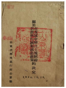 山东省胶东区行政公署《关于在查减中解决土地纠纷的决定》指出:“胶东地区自施行减租减息法令后,人民生活已得到初步改善,抗日的群众组织亦逐步扩大巩固。同时由于这一政策之初步深入实行,人民土地纠纷也次第被发现出来,各级政府处理这些土地纠纷,因缺乏比较一致的具体办法,往往政策上多有出入。为使各级政府在贯彻查减中,能够准确恰当的给各阶层人民解决土地问题,本署特根据中共中央关于抗日根据地土地政策的决定及其附件,及山东省租田暂行条例之方针原则,与胶东土地问题具体情况,制定此决定,通令公布实施。”