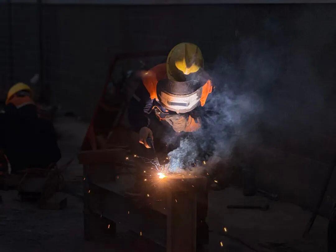 在鑫矿服材料科技公司的生产车间里,电焊员工们正以专业的姿态投入工作。他们头戴黄色安全帽,身着统一的工装,佩戴着电焊面罩,在焊花飞溅、烟雾缭绕中,专注地对设备进行焊接作业,以精湛的技艺和严谨的态度,在工业生产的一线默默耕耘,用每一次精准的焊接,为公司的设备制造与维护筑牢根基,彰显着产业工人的专业素养与责任担当,成为推动企业生产发展的坚实力量。