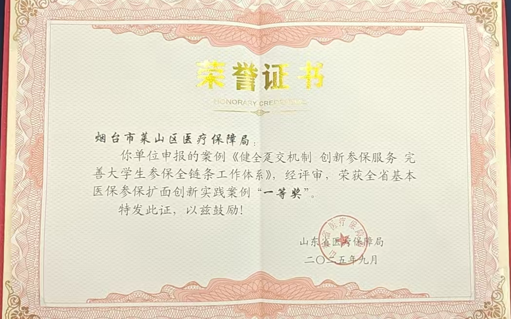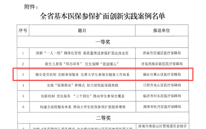 近日,山东省基本医保参保扩面推进会议在临沂市召开。会上,宣读了《关于公布全省基本医保参保扩面创新实践案例的通知》,经前期公开征集、初审和专家评审等环节,综合考虑工作创新性、实效性和示范性等因素,最终确定全省创新实践案例30个(一等奖6个、二等奖10个、三等奖14个)。其中,莱山区提报的创新实践案例《健全趸交机制 创新参保服务 完善大学生参保全链条工作体系》荣获全省基本医保参保扩面创新实践案例“一等奖”,是全市唯一获得“一等奖”的区市。