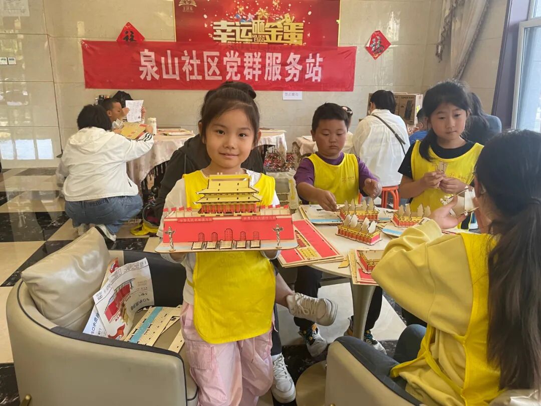 绿谷丰泽苑党群服务站联合绿谷丰泽苑置业公司举办以“榫卯传匠心 拼筑爱国情”为主题的爱国主义教育活动。活动将传统榫卯工艺与国庆主题相结合,青少年们亲手拼接天安门模型,在实践中深入了解了中国古建筑不用一钉一铆却能屹立千年的榫卯结构精髓,感受传统木工技艺的同时,厚植家国情怀,作品在小区内设展展示,增强文化自信与民族自豪感。