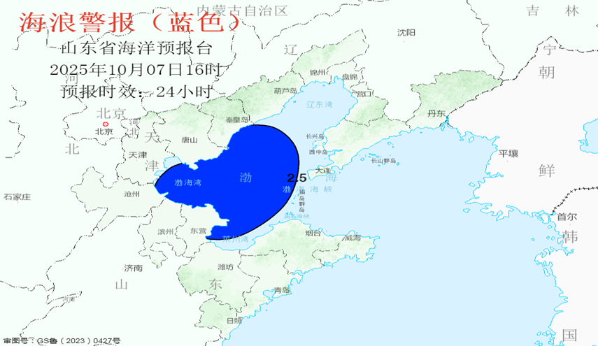 山东省海洋预报台根据《山东省风暴潮、海浪、海啸和海冰灾害应急预案》发布海浪蓝色警报。
