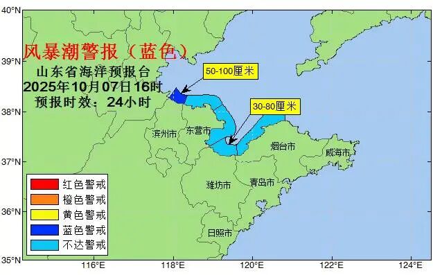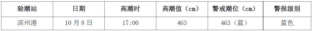 受冷空气影响,预计10月8日凌晨至8日下午,渤海湾和莱州湾沿岸将分别出现50-100cm和30-80cm的风暴增水。滨州港验潮站将出现达到当地蓝色警戒潮位的高潮位。山东省滨州市预警级别为蓝色。