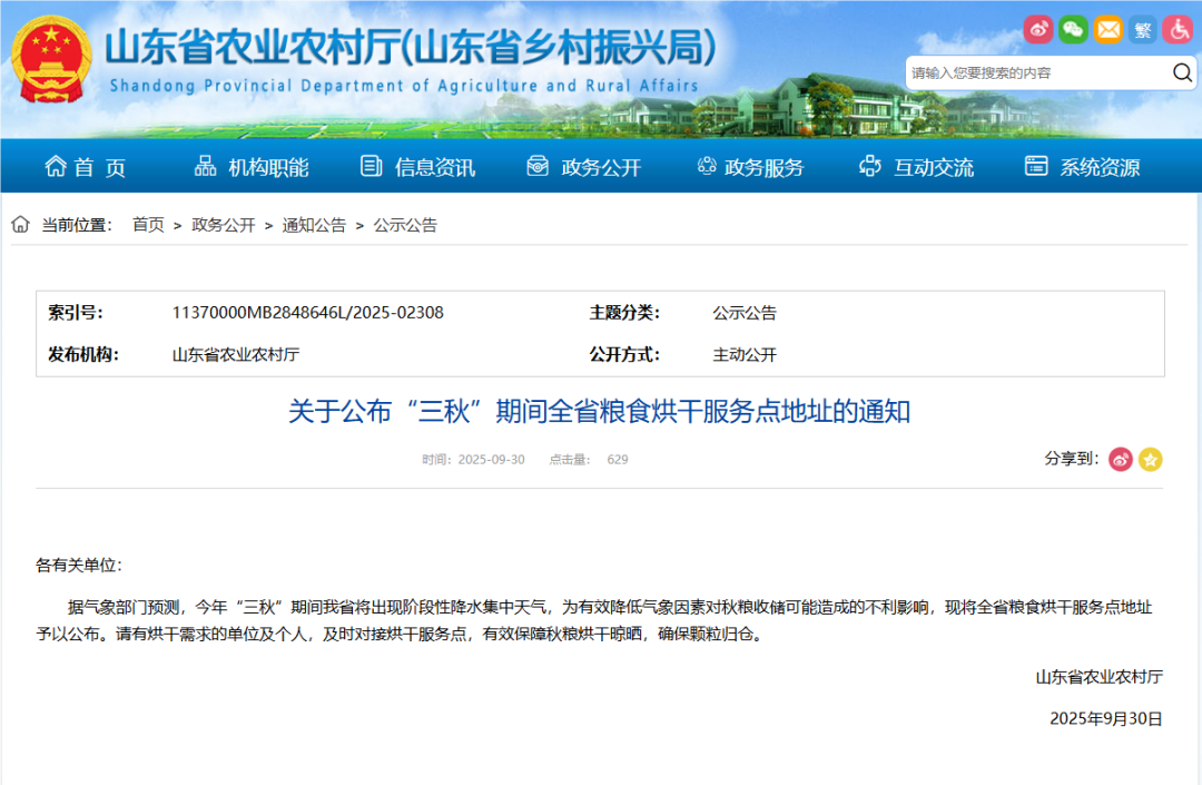 最近,阶段性集中降水、持续阴雨天气在农业上给秋粮晾晒、收储带来不小挑战,湿粮霉变风险显著增加,眼下正值“三秋”生产关键期,为守住粮食丰收成果山东省农业农村厅公布“三秋”期间全省粮食烘干服务点地址,详情如下: