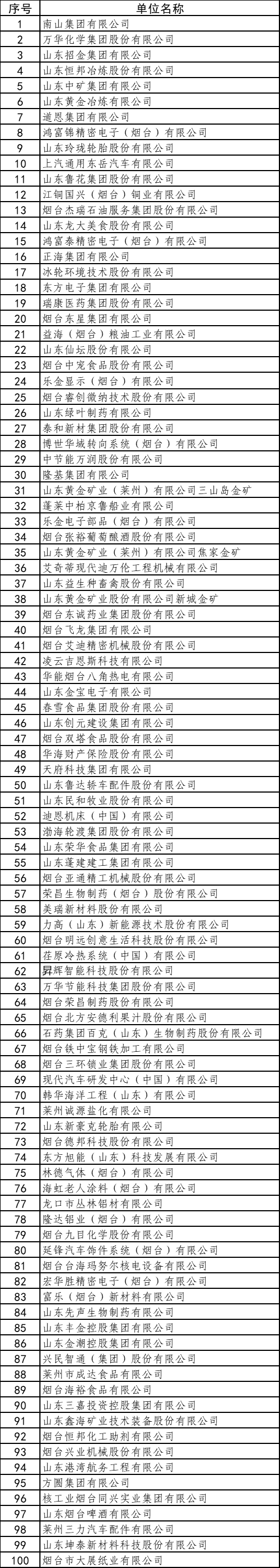 烟台融媒10月10日讯 为充分发挥先进典型示范引领作用,引导广大企业加快做大做强做优,打造具有国际一流竞争力的领航企业,更好服务全市重大发展战略,市企业联合会按照国际通用规则,依据企业2024年营业收入数据,由企业自愿申报、市企业联合会组织审核后上报市工业和信息化局,经公示无异议,确定了2025烟台企业100强名单,现予以公布。