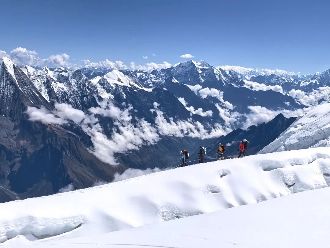 攀登马纳斯鲁峰是一项既艰巨又刺激的挑战。在海拔7000米以上,氧气含量非常稀薄,气压较低,攀登者不仅需要携带充足的氧气,还需要有强健的体魄,以及坚定的心智。“8000米以上真的是人类禁区,时机、天气、运气、体力,一样都不能少。”刘鑫鹏说,上山过程中,需要攀爬许多近乎垂直的冰壁,考验的不仅是个人体力、臂力,更需要团队合作共同完成。