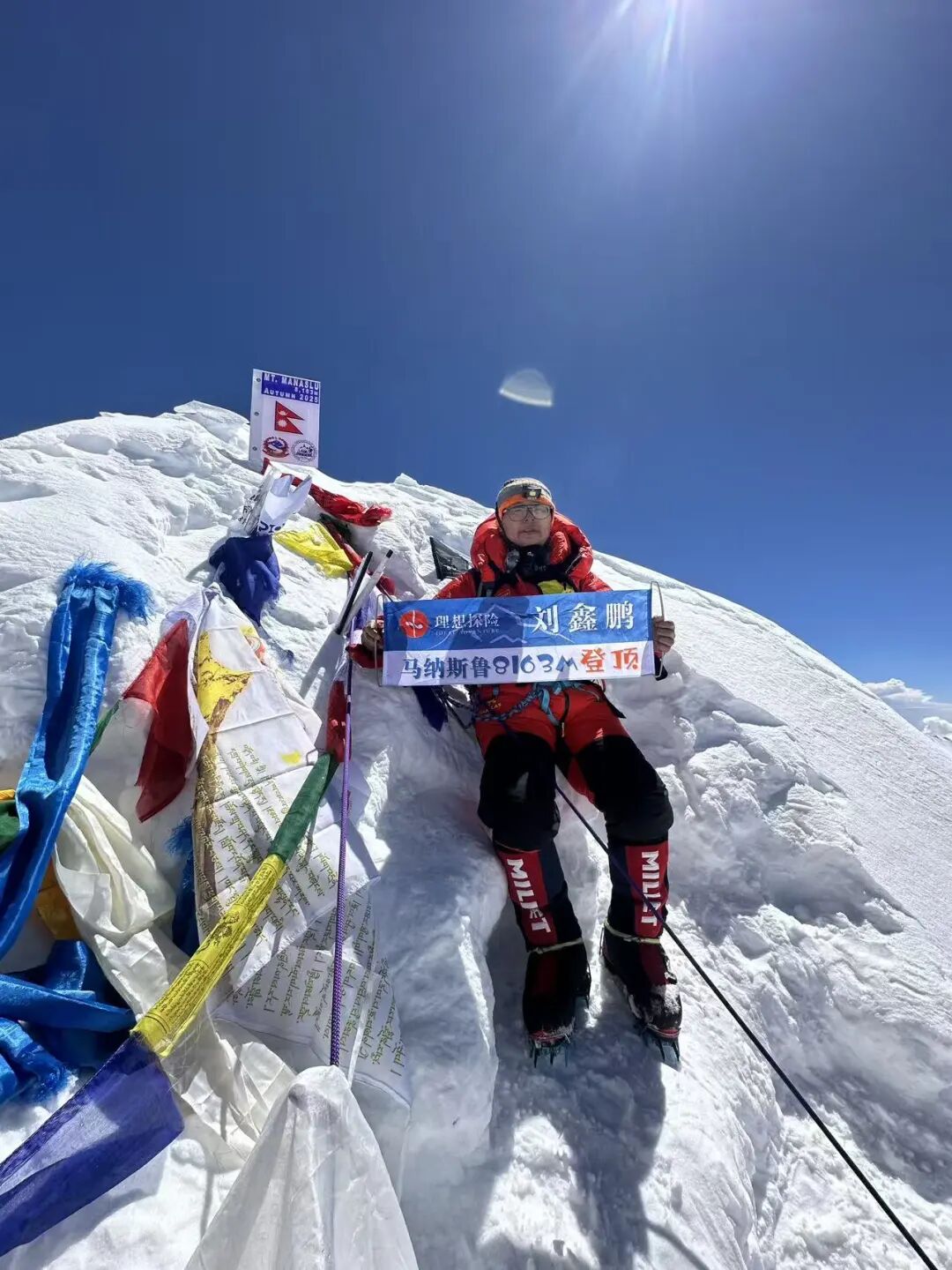 负重十几公斤、穿着厚重的登山服和登山靴,随着海拔的升高,低温、缺氧愈加严重……9月23日凌晨,在C4营地,刘鑫鹏和队友未做休息,直接向顶峰发起冲锋!面对攀登过程中的各种突发状况,刘鑫鹏和另外4名中国队员一起经受住了体力和意志力的极大挑战,于尼泊尔时间上午7点30分左右成功登顶世界第八高峰马纳斯鲁峰。
