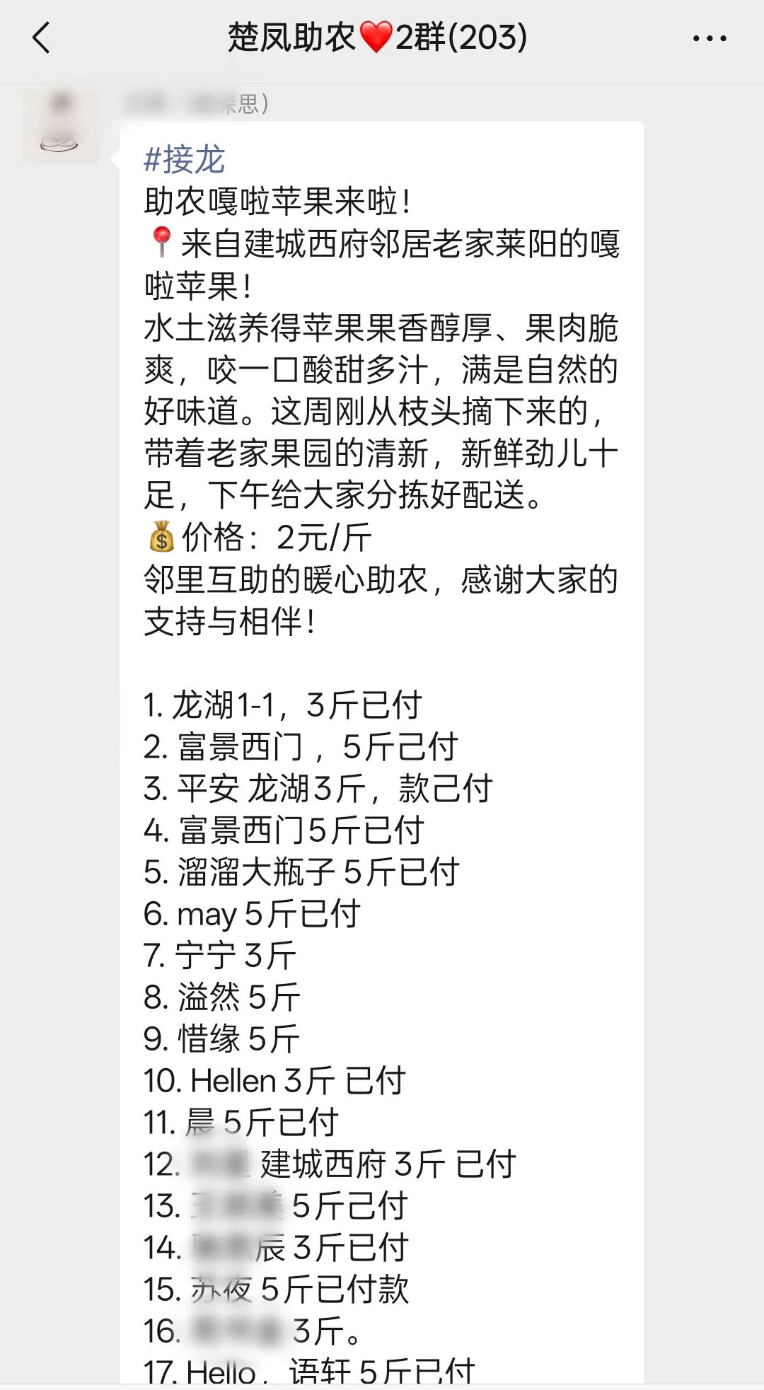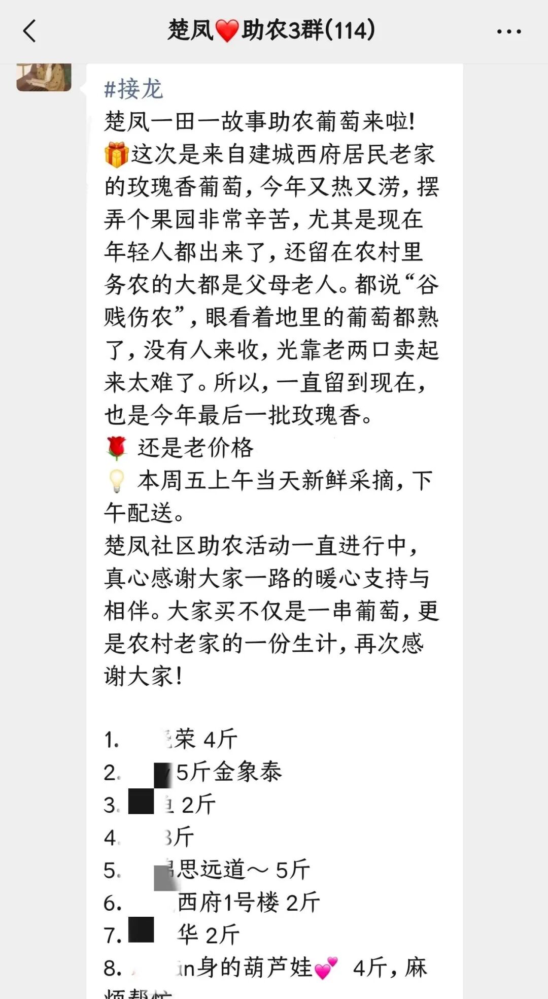 面对现实问题,楚凤社区党委发起“暖心助农”行动,构建起“党组织牵头、农户直供、邻里互助”的公益服务平台。凤凰台街道楚凤社区党委书记、居委会主任王晓慧介绍,社区对农户坚持“零收费”,不收取任何渠道费用。同时为居民严格把关,从源头控品质,并负责全程配送与售后。平台采用线上微信群接龙预订,线下集中配送的模式,打造“线上订、按需采、网格送”的15分钟生鲜服务圈。