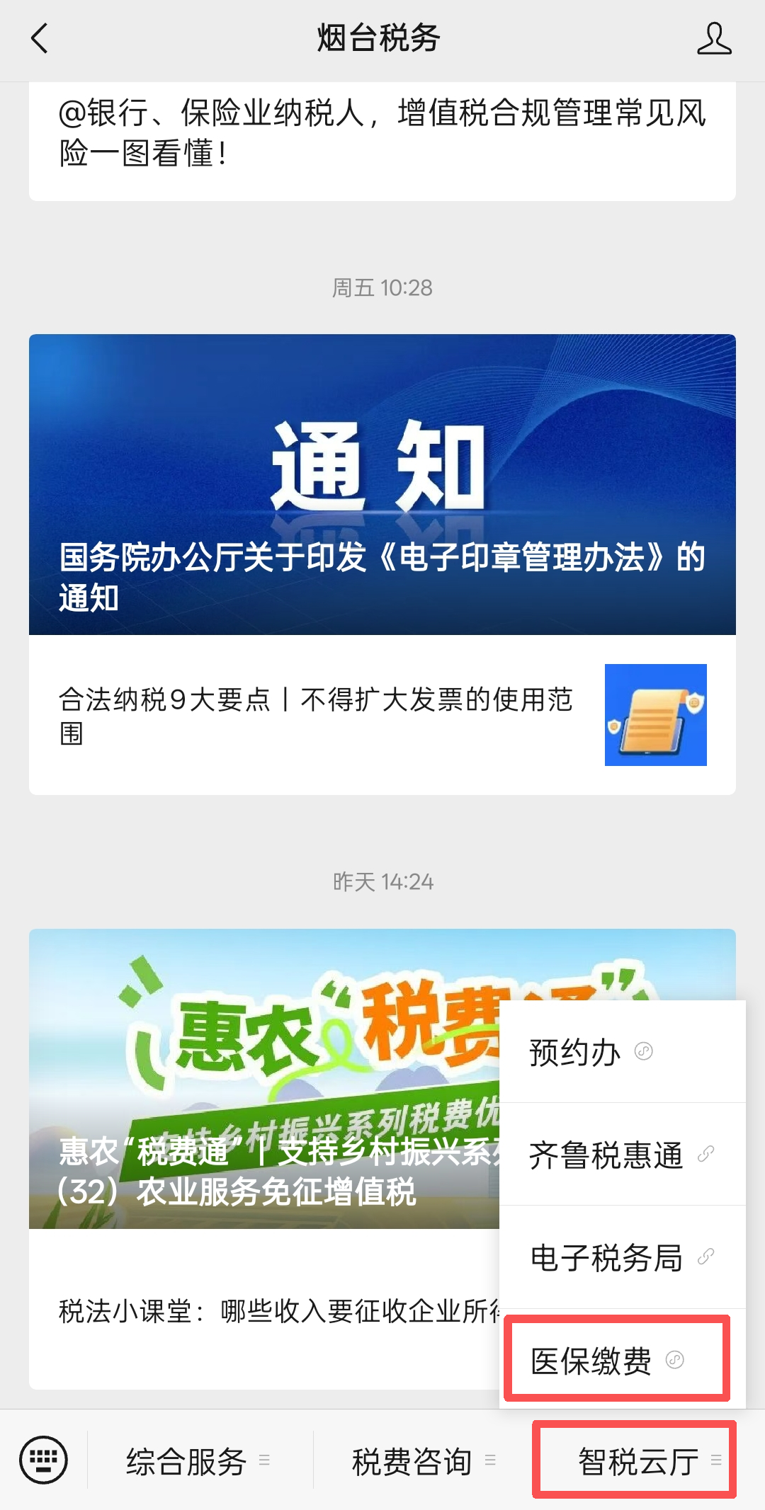 2.微信缴费操作流程:关注“烟台税务”微信公众号,从底部菜单栏找到“智税云厅”——医保缴费——城乡居民——居民医疗,勾选缴费人员和缴费年度——选择缴费档次——微信缴费或家庭共济缴费。