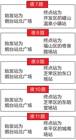 5条夜间线路分别是夜7路、夜8路、夜9路、夜10路、夜11路,始发站为烟台站北广场,单向发车。据了解,铁路到达烟台站最晚的时间是23:14,5条夜间线路发车时间为22:45、23:15、23:30,完全覆盖夜间最后一批出站旅客。线路设置上也是综合考虑,夜7路终点站为开发区的磁山温泉小镇站,夜8路终点站为福山区的奇泉路场站,夜9路终点站为芝罘区的东口场站,夜10路终点站为芝罘区的东陌堂场站,夜11路终点站为牟平区的城南场站,基本实现了区域全覆盖。