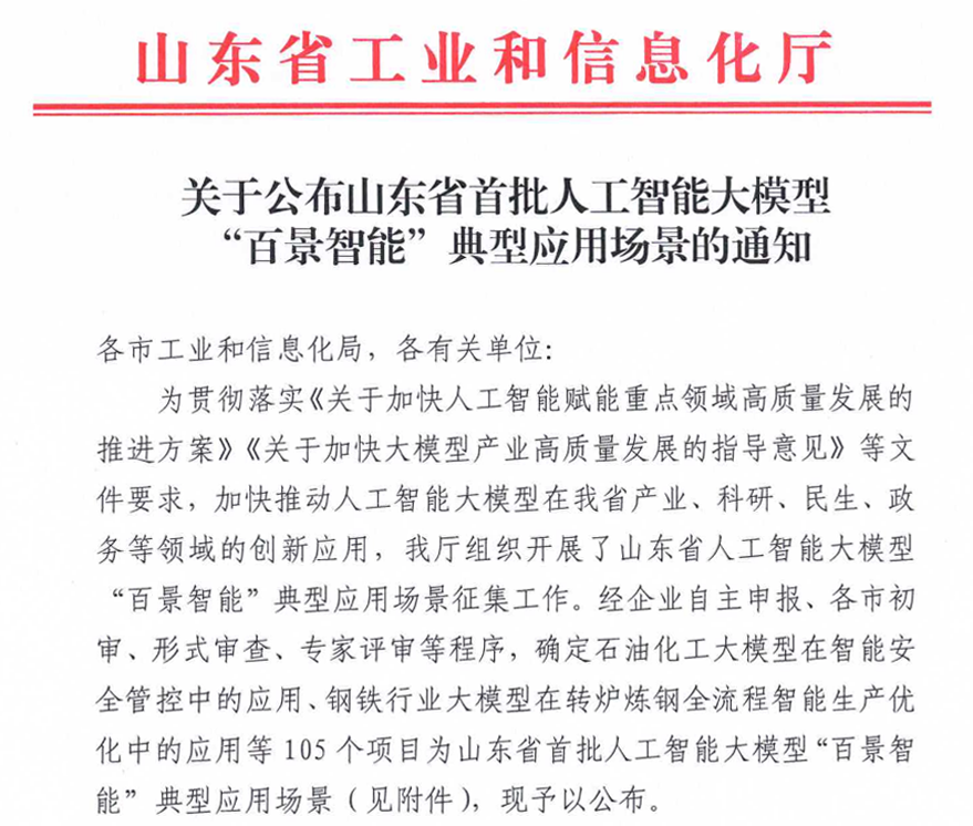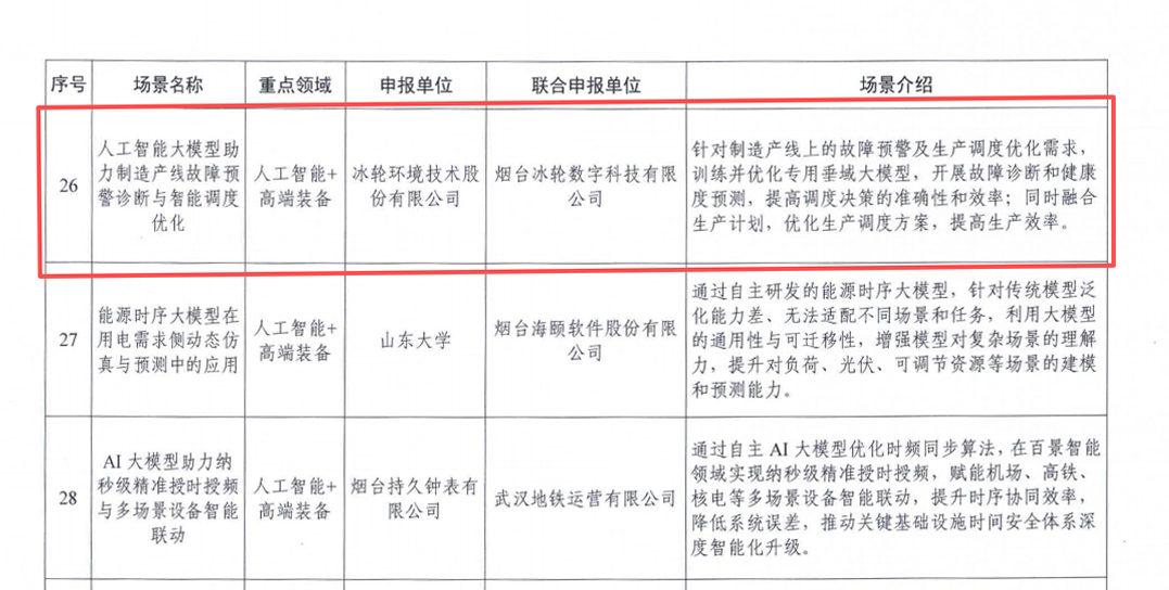 近日,省工信厅公布了山东省首批人工智能大模型“百景智能”典型应用场景项目名单,芝罘区冰轮环境技术股份有限公司的“人工智能大模型助力制造产线故障预警诊断与智能调度优化”场景成功入选。