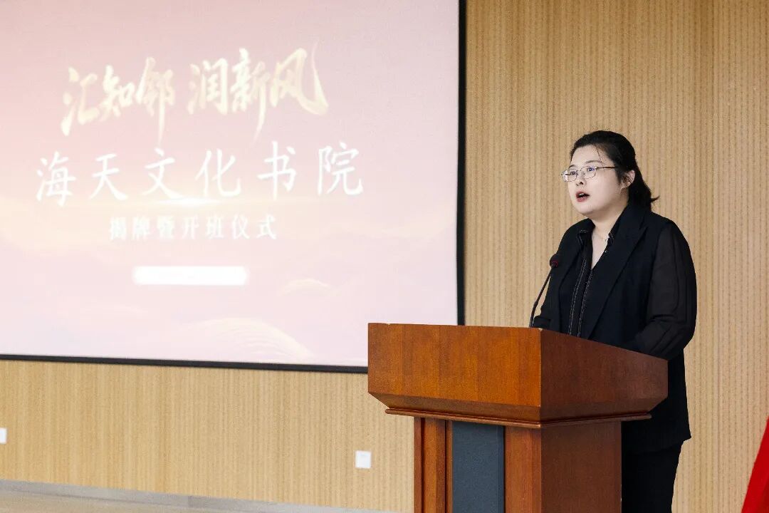 仪式在主持人富有感染力的开场白中拉开帷幕。随后,高新区管委副主任刘晓琳登台致辞,从文化赋能社区治理、精神滋养居民生活的高度,深刻阐释了成立海天文化书院的社会价值。她指出,建设社区文化书院,是省、市、区推动优质文化资源下沉基层、实施全民美育工程的重要举措,海天文化书院的成立,既是对群众精神文化需求的精准回应,更是推动社区文化软实力跃升的重要实践。海天社区党总支书记王玲玉表示,将全力把海天文化书院打造为充满活力与温度的社区文化共同体,让每一位居民都能在这里找到属于自己的精神归属,发现志同道合的伙伴,激发创造生活的热情,挚的话语引发全场共鸣,为仪式奠定了厚重而温暖的基调。