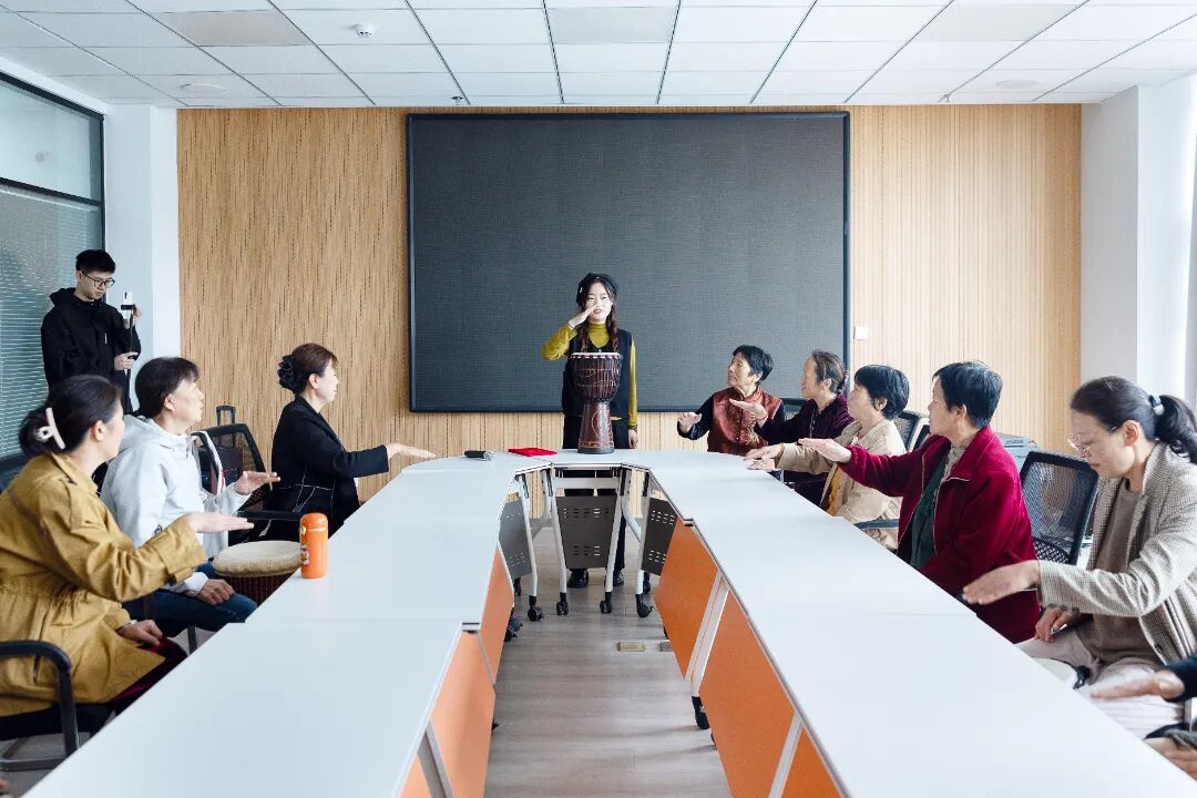 仪式结束后,工作人员引导有兴趣的居民前往指定活动室,开启非洲鼓、声乐等沉浸式体验课——非洲鼓教室中,鼓点与欢笑交织,居民们跟着讲师的节奏,感受韵律之美。“以前自己瞎琢磨总找不到窍门,现在有专业老师教,一下子就入门了!”在非洲鼓体验区,居民王阿姨擦着额头的汗,笑容灿烂。