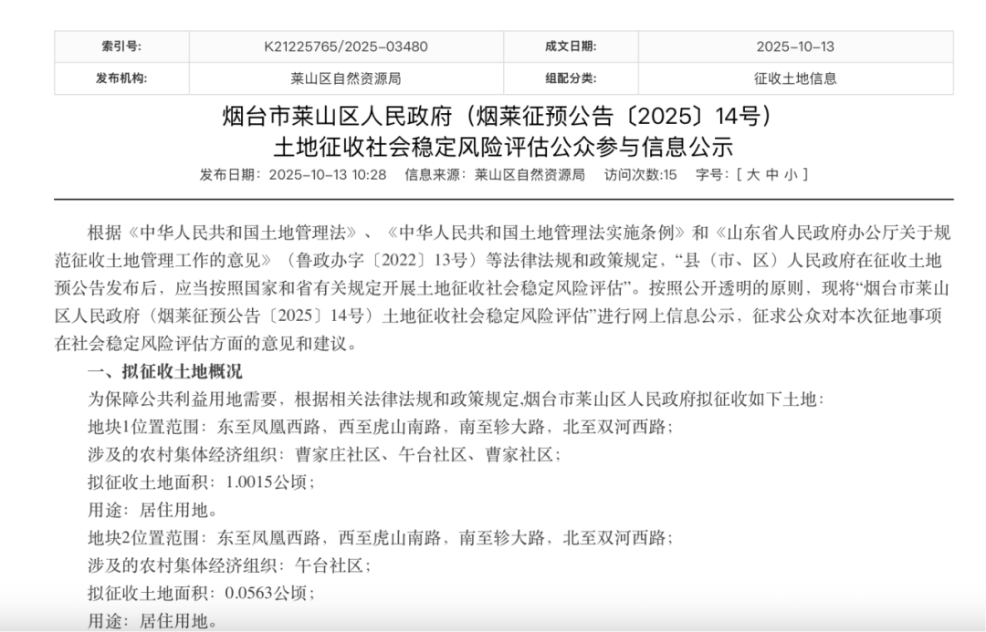 记者从莱山区自然资源局获悉,为保障公共利益用地需要,莱山区人民政府近日发布了《烟莱征预公告〔2025〕14号》,拟征收位于中心城区范围内的两宗土地,主要用于居住用地开发。目前,该征地项目已启动社会稳定风险评估工作,并于10月13日起进行公众参与信息公示,广泛听取社会各界特别是被征地居民的意见和建议。