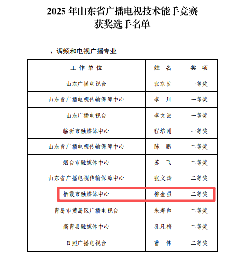 在山东省广播电视局、山东省总工会举办的2025年山东省广播电视技术能手竞赛,栖霞市融媒体中心柳金强凭借卓越表现荣获调频和电视广播专业个人二等奖。