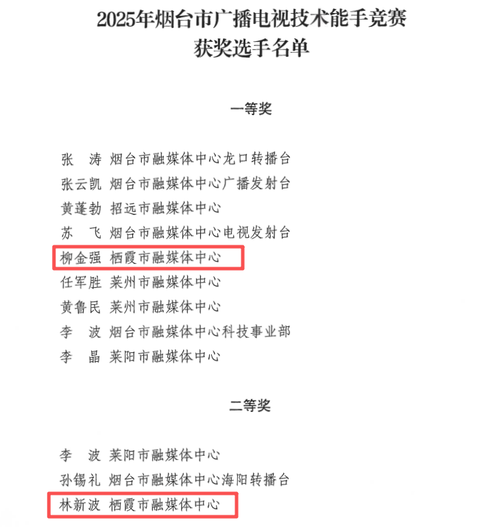 在烟台市文化和旅游局举办的2025年烟台市广播电视技术能手竞赛中,栖霞市融媒体中心柳金强荣获一等奖,林新波荣获二等奖。