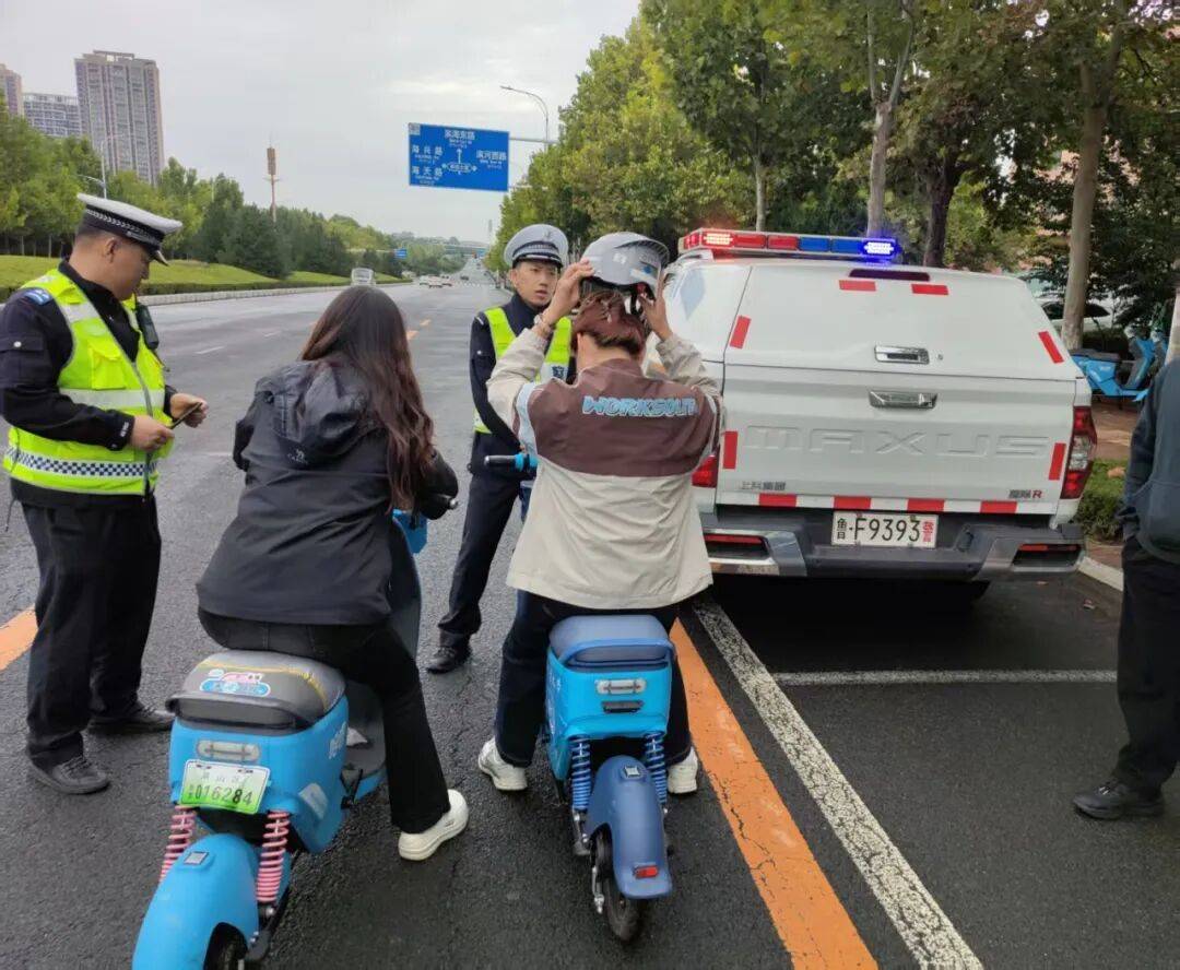 烟台融媒10月14日讯(记者 金海善 摄影报道)为进一步维护安全有序的道路交通环境,提升市民交通安全意识,有效预防和减少道路交通事故,烟台市公安局交通管理支队近日在全市范围内启动电动自行车交通安全专项整治行动,对包括不按规定佩戴安全头盔在内的五类重点违法行为进行严格查处。