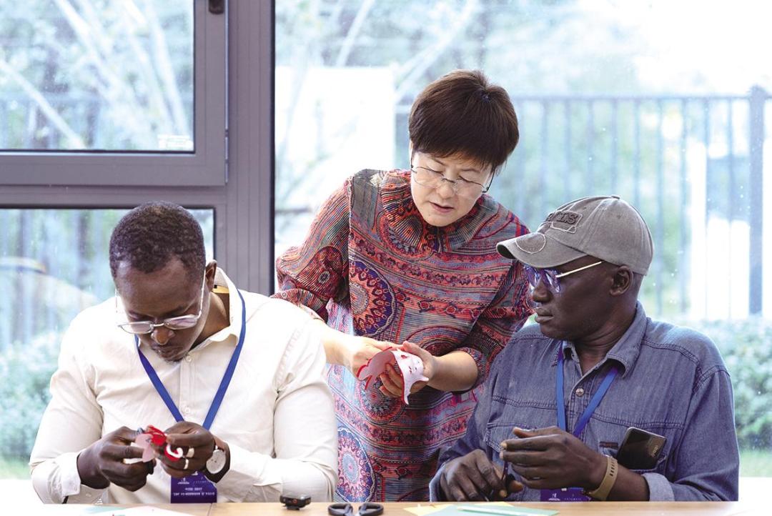 活动特别邀请山东城市服务职业学院文化与创意学院曲娜老师授课。曲娜老师展示了寓意吉祥的烟台剪纸作品,从剪纸的历史渊源、工具使用到基本技法,耐心地向海外友人讲解示范。在老师的指导下,他们手持剪刀,小心翼翼地在红纸上勾勒、裁剪,经过半个多小时的努力,一幅幅吉祥喜庆的剪纸作品陆续完成。来自秘鲁的尼卡诺尔·帕洛米诺拿着自己剪出的八角团花兴奋地说:“这是我第一次尝试剪纸,虽然过程有点难,但最后展开纸,看到镂空纸张组成的美丽图案,特别有成就感。”