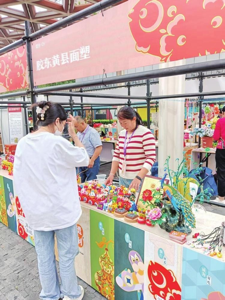 在活动现场,“可观、可玩、可品”的立体体验场景让游客流连忘返。憨态可掬的黄县泥老虎被争相当作伴手礼;刚出锅的五香熏鲅鱼香气四溢,摊位前始终排着长队;晶莹剔透的龙口粉丝通过现场烹饪展示,让游客直观感受其独特之处。此外,传承人还开展公益培训活动,手把手教游客制作剪纸、面塑等作品,让大家亲身感受非遗技艺的乐趣。