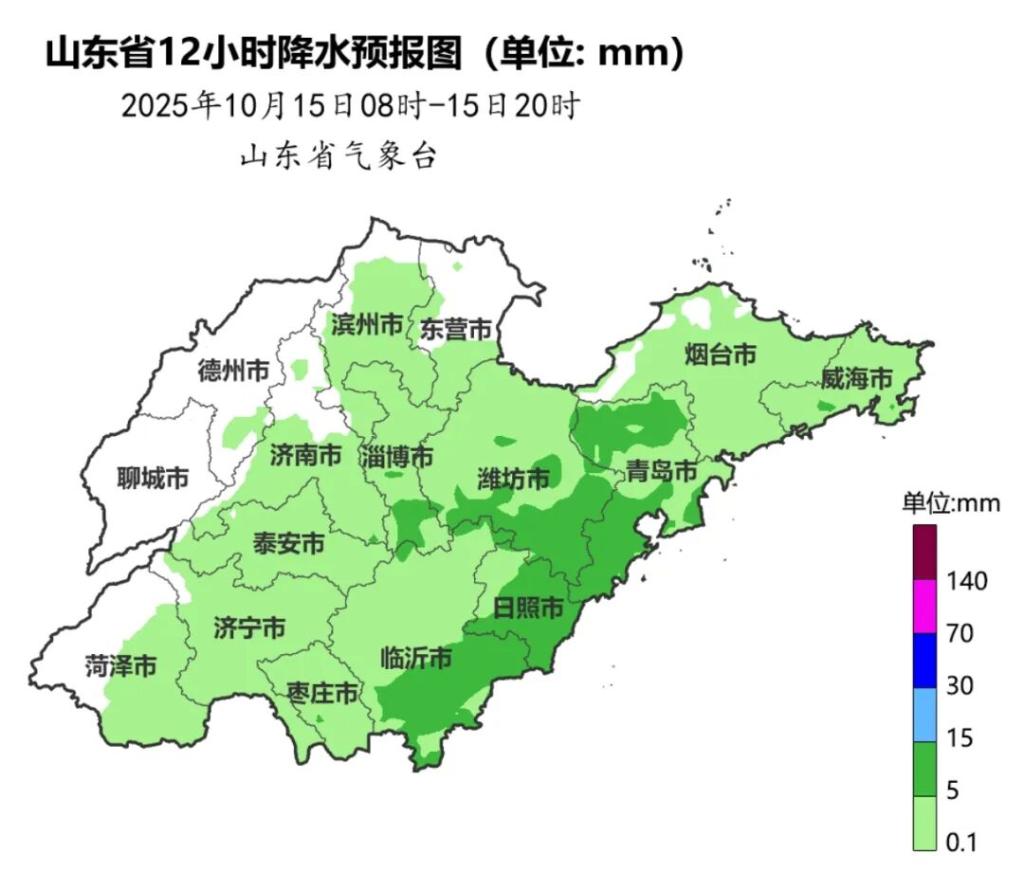 15日白天到夜间,鲁中、鲁南和半岛地区天气阴有小雨转多云,其他地区天气阴局部有小雨转多云;济南北部、德州北部、滨州、东营西部、淄博北部和潍坊西部15日早晨有雾或轻雾。