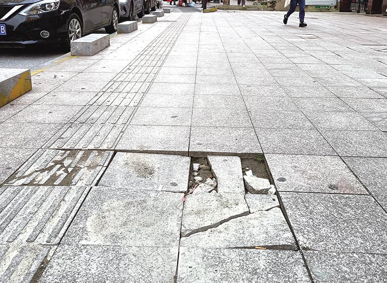15日,记者根据市民反映来到芝罘区四德街,看到在振华购物中心西门对面人行道上,有多处人行道板已破碎,行人经过此处时,都小心翼翼地避开破碎的人行道板。