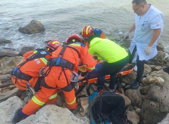 海边乱石密布,风大浪急,坡度近60度的湿滑崖壁,进一步增加了转运风险,消防员以接力传递、手抬肩负的方式,竭力保持担架平衡,严防二次伤害发生。