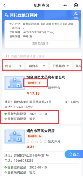 想快速上手?您可以直接扫描“便民找药”二维码,点击“查药品”,选自己想买生产企业和包装规格的药品,再按距离、区市或价格排序,就能看到地址位置、联系电话,甚至剩余库存和最新结算记录,哪家划算、哪家有货,一眼看清。具体操作流程: