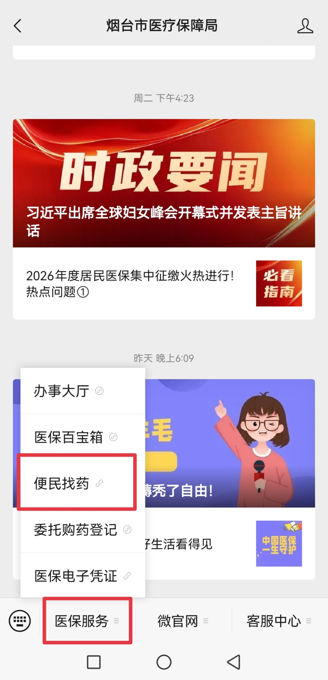习惯从公众号进入?您可以打开“烟台市医疗保障局”微信公众号,点左下角“医保服务”,再选“便民找药”,同样能直达小程序,老人跟着步骤走也能轻松操作。