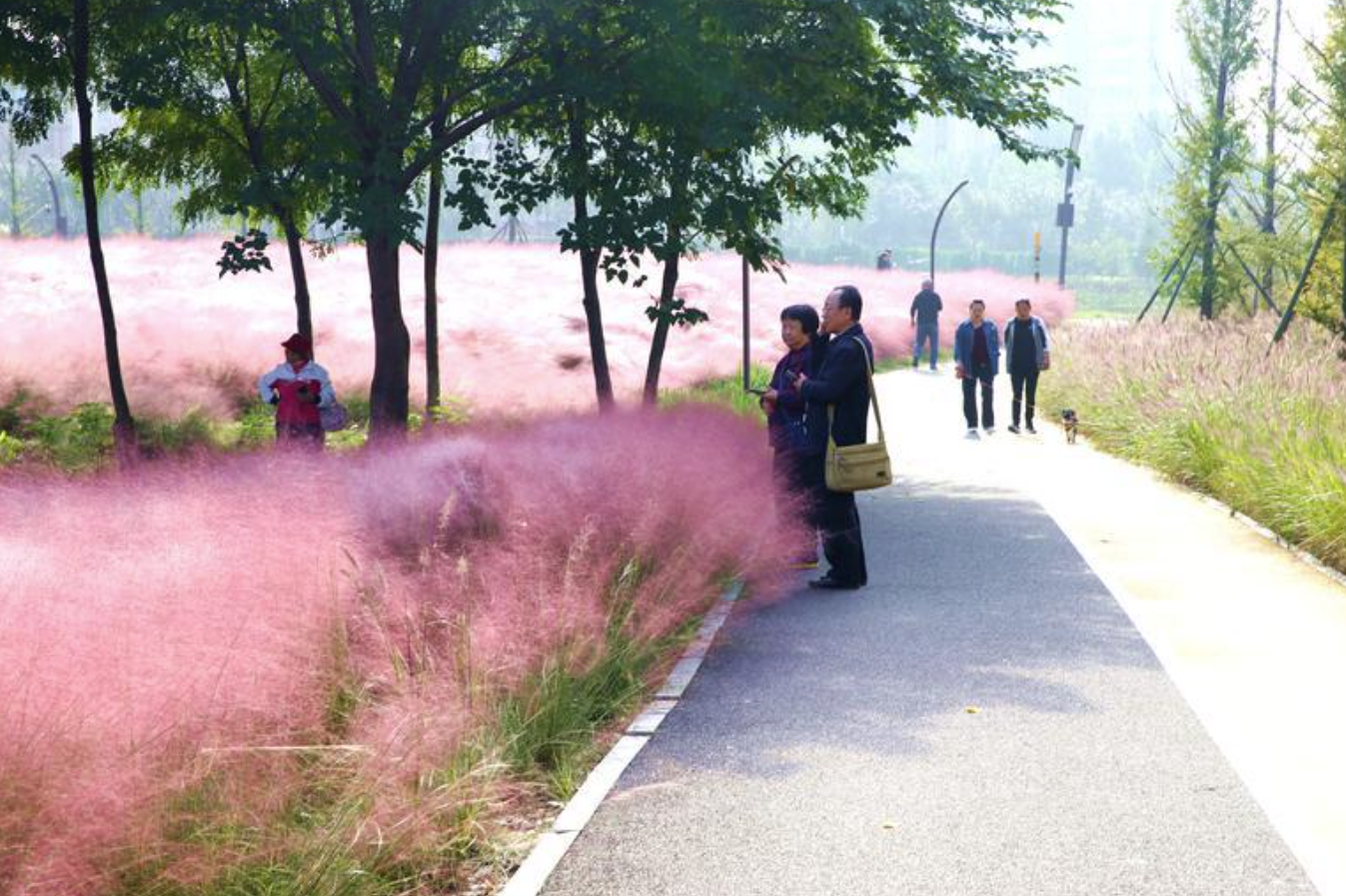 在烟台福山区隅园北岸清洋河路与王懿荣大街交界处夹河边,游人漫步在粉黛乱子草中的小路上。眼下,粉黛乱子草进入花期,成片的粉色花穗轻摇,似云雾漫铺,又似粉色花海,为秋日增添了别样的浪漫氛围。记者 邹春霞 通讯员 吴金洋 摄