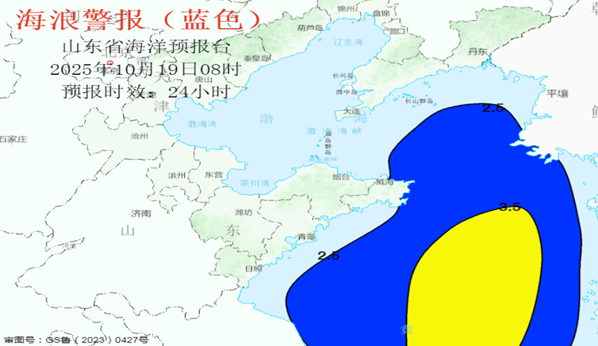 山东省海洋预报台根据《山东省风暴潮、海浪、海啸和海冰灾害应急预案》发布海浪蓝色警报。