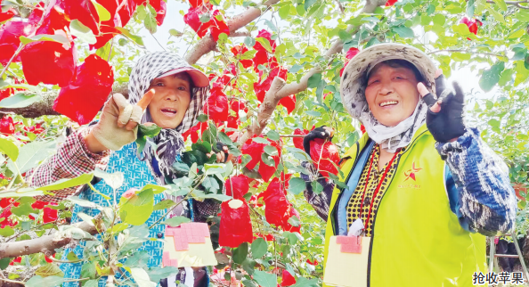 王村果园里一片热火朝天的劳动景象。身着马甲的党员志愿者们在接受果农的简要培训后,迅速投入到紧张的劳动中。他们两三个人一组,分工协作,动作从生疏到熟练,小心翼翼地把纸袋打开,轻轻取下包裹苹果的纸袋,确保不损伤娇嫩的果面。阳光透过枝叶洒下,映照着一张张汗涔涔却充满干劲的脸庞,与绿马甲、红苹果共同构成了一幅美丽的秋收画卷。
