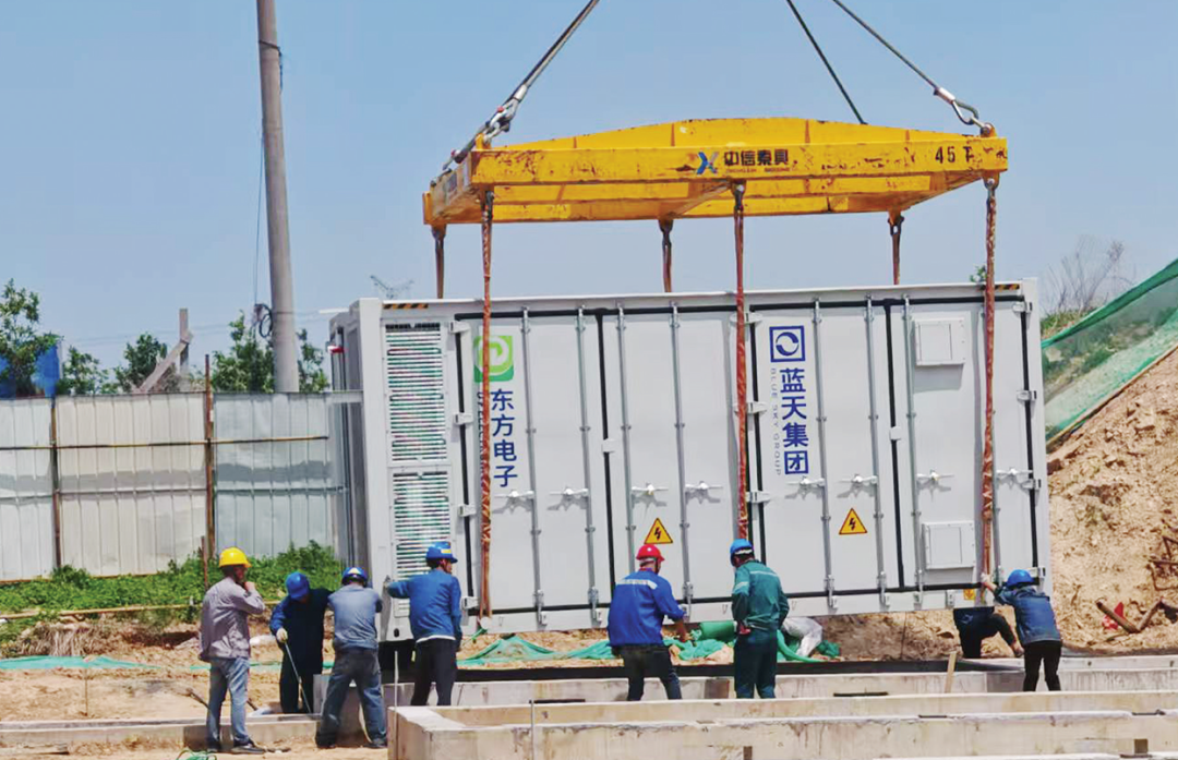 在烟台储能中心(西部)1GW/2GWh项目建设现场,施工人员正在吊装“超级充电宝”。 YMG全媒体记者 杨春娜 摄