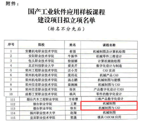 日前,中华职业教育社职业指导中心公布国产工业软件应用样板课程建设项目名单,烟台职业学院《机械制图》《机械制图与CAD》2门课程榜上有名。