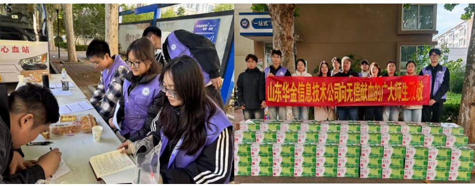 献血现场功能分区明确,登记区、扫码区、采血区、休息区设置科学。校医院、血站医护人员与志愿者协同配合,全程守护献血安全。山东华金信息技术有限公司为献血者提供了牛奶等营养品,中餐学院和西餐学院还特别熬制了补血汤品,温暖每一位献血师生。