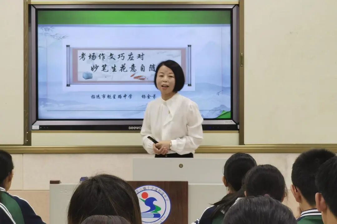 魁星路中学杨金芬老师在十字道初中执教示范课《考场作文巧应对,妙笔生花意自随》,就2025年烟台市中考作文《何不拥抱》进行考场作文写作指导。课堂以歌曲《世界赠予我的》导入,引领学生解读歌词、分析中考作文评分标准,从思想、内容、结构、表达四个维度就《何不拥抱》进行构思交流,探寻考场作文高分秘笈。