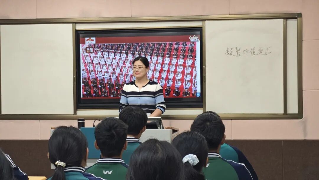 泉山初级中学的王华珍老师在蚕庄学校执教新授课《凝聚价值追求》时,秉持议题式教学的理念,以九三阅兵为情境主线,精心设置序列化任务。她引导学生珍惜时代机遇,不负青春韶华,通过奋斗书写青春宣言书,充分彰显了道德与法治学科在培根铸魂、启智增慧方面的独特价值。
