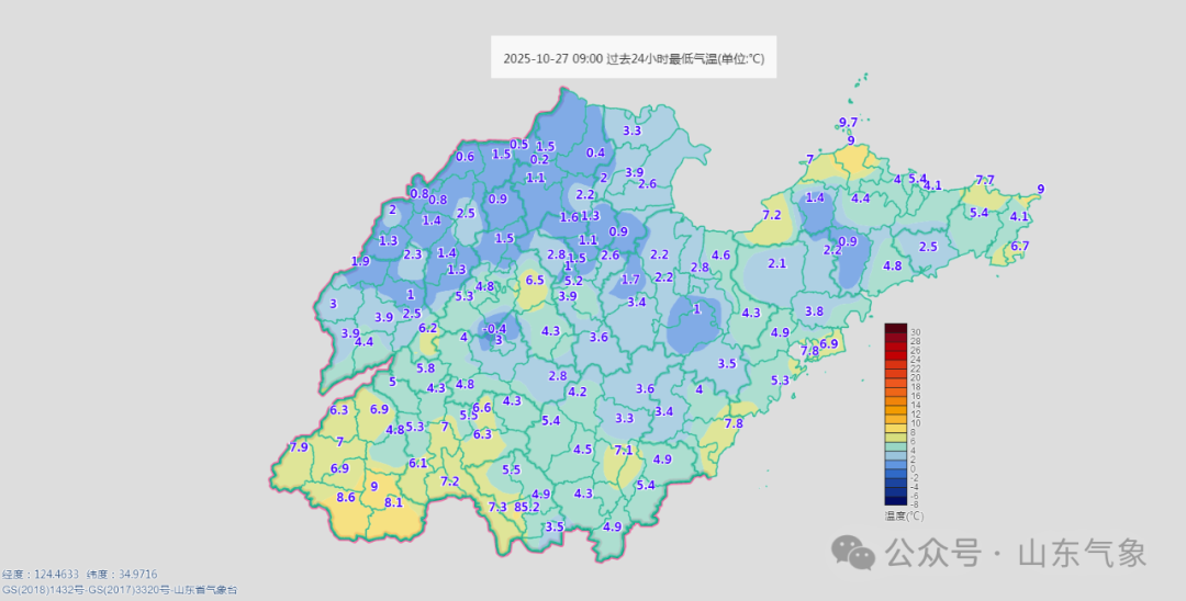 今天(10月27日),冷空气继续影响我省,从过去24小时最低气温实况来看,降温区域主要集中在鲁西北一带,最冷的地方接近冰点。接下来我省将开启升温模式,但月底还将有一股冷空气来袭,需保持关注。