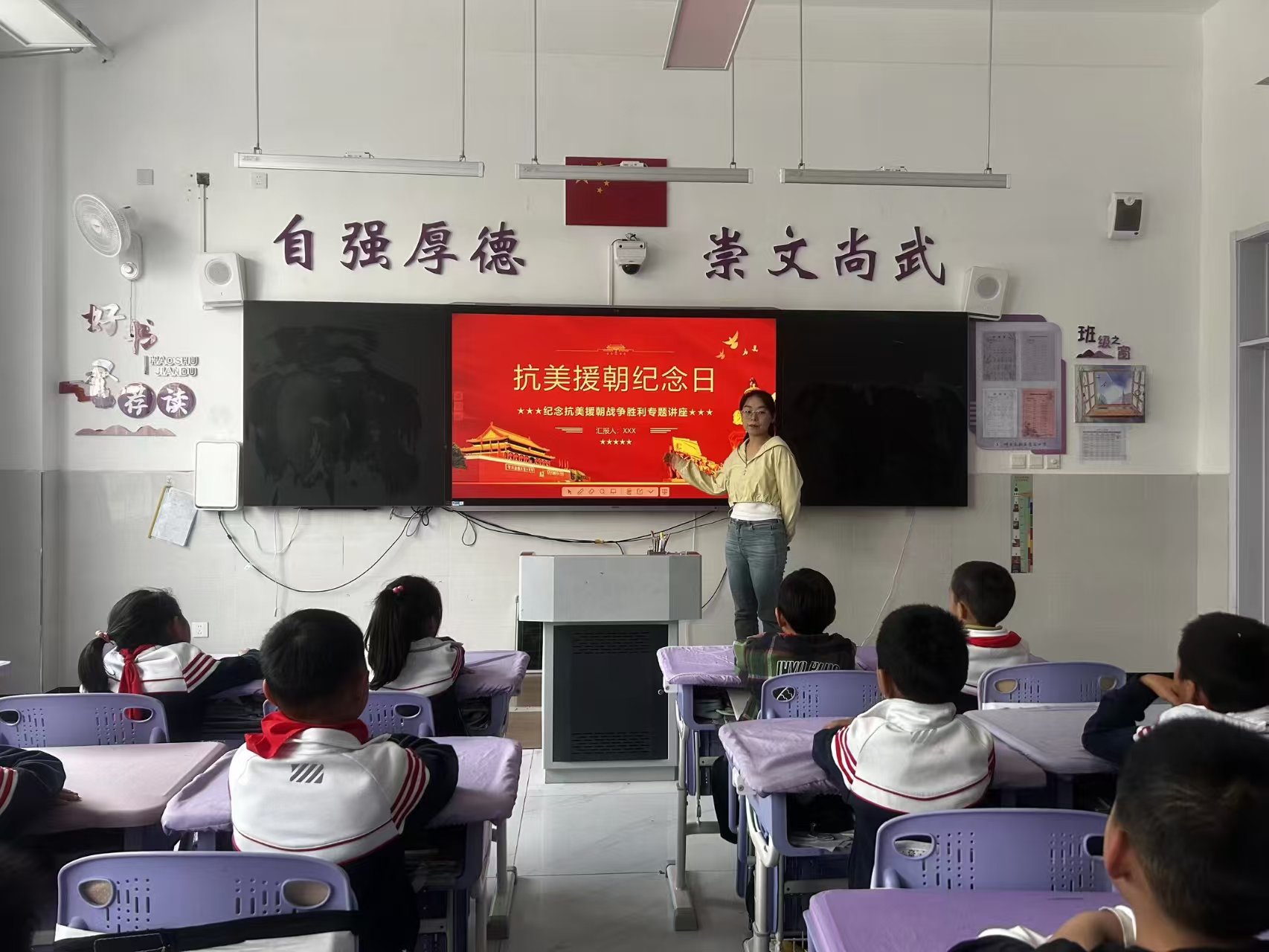 在各班级的主题班会上,班主任通过史料图片、战役视频,带领学生走进抗美援朝战场。长津湖的“冰雕连”、上甘岭的坑道坚守……一个个历史瞬间深深触动了同学们。在互动环节,大家积极分享所知的英雄故事,有的朗诵战地诗歌,有的展示手绘的英雄画像,纷纷表示要学习志愿军不怕苦、不怕难的精神。