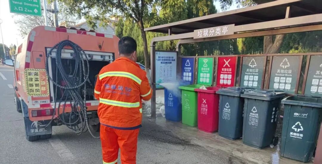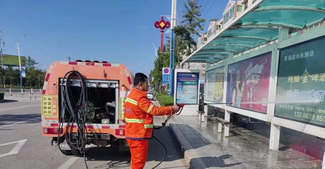 保洁队伍对沿街1100余个垃圾桶、果皮箱以及公交站牌等设施进行逐一冲洗,做到随污随清。作业中,工作人员先用高压水枪冲落表面灰尘与污渍,再用工具反复擦拭,不放过任何犄角旮旯、砖缝墙角,确保环境卫生不留死角。