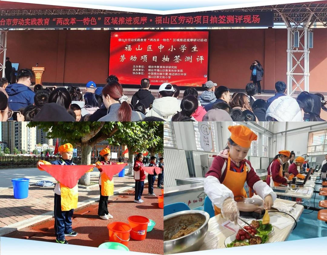 与会人员走进烟台格迈纳尔中学观摩了福山区31所中小学、10个劳动项目的劳动素养测评抽签制展示,在福山区西关小学和福海路小学分别观摩了试点学校综合实践活动课题研究备案制成果材料展示与福山区“劳动+”特色课程实践展示。