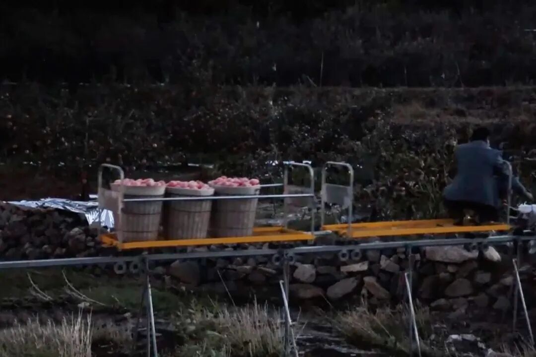 为解决群众采收运输“最后一公里”难题,桃村镇大胆创新,让轨道车上山,从路边延伸至山顶,解决了果农的燃眉之急。“省力化”的背后,是果农实实在在的便利和增收。据了解,单条轨道一次可运输六筐苹果,三台设备覆盖整片山地果园,能够大幅降低人力成本,显著提升采收效率。