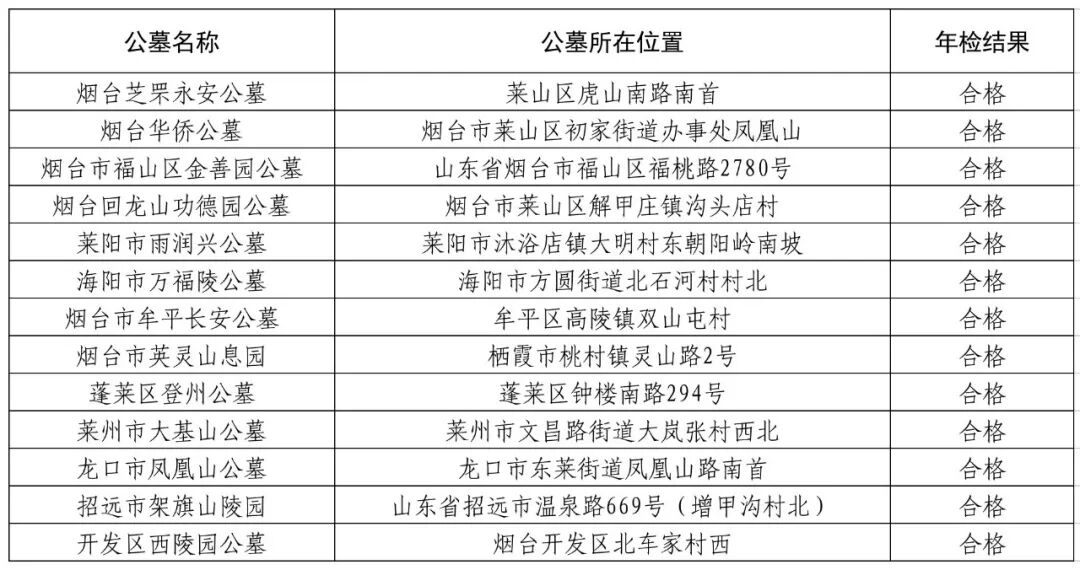 根据《山东省公墓管理办法》《山东省经营性公墓管理工作指引(试行)》要求,市民政局联合市场监督、自然资源、林业等部门对全市13家经营性公墓开展年度检查,现将检查结果公布如下: