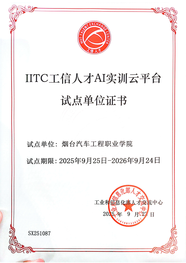 10月27日,工业和信息化部人才交流中心发布《公布IITC工信人才AI实训云平台首批应用院校的通知》,烟台汽车工程职业学院成功入选首批IITC工信人才AI实训云平台试点单位。